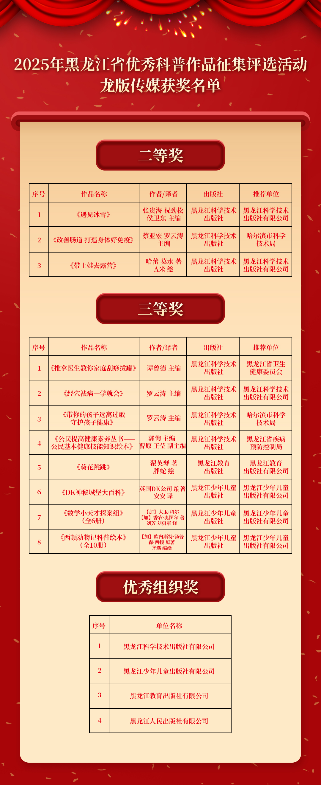 近日,黑龙江省科技厅组织开展2025年黑龙江省优秀科普作品征集评选活动,龙版传媒11部出版图书荣获2025年黑龙江省优秀科普图书作品奖,4家出版单位荣获优秀组织奖。