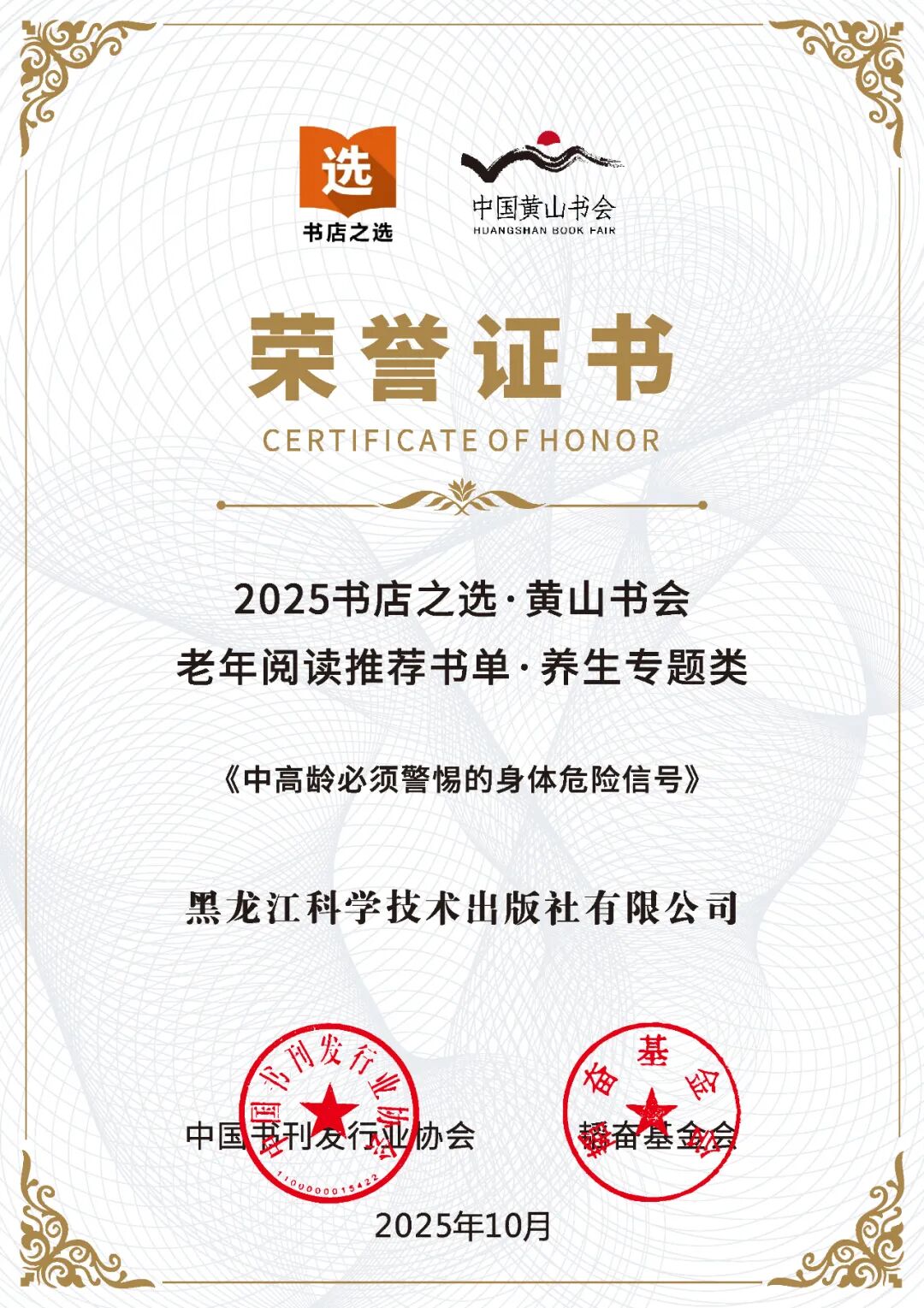 2025年11月15日,由中国书刊发行业协会、韬奋基金会、安徽新华传媒股份有限公司联合主办,北京开卷信息技术有限公司协办,安徽省出版协会发行工作委员会等承办的首届老年阅读创新发展大会,于中国黄山书会期间举行。黑龙江科学技术出版社有限公司出版的《中高龄必须警惕的身体危险信号》一书,凭借其对中高龄人群健康关怀的专业价值,成功入选“2025 书店之选・黄山书会老年阅读推荐书单・养生专题类”。